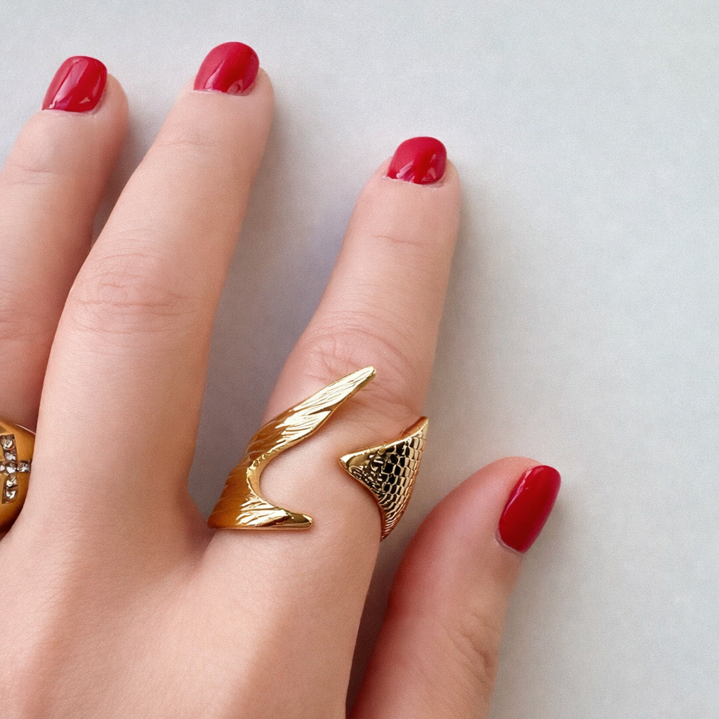 The Mermaid Ring is where fluid elegance meets sharp, sculptural design. Inspired by the movement of ocean waves and the strength beneath the surface, this gold filled statement ring wraps around the finger with a striking, armor-like silhouette.