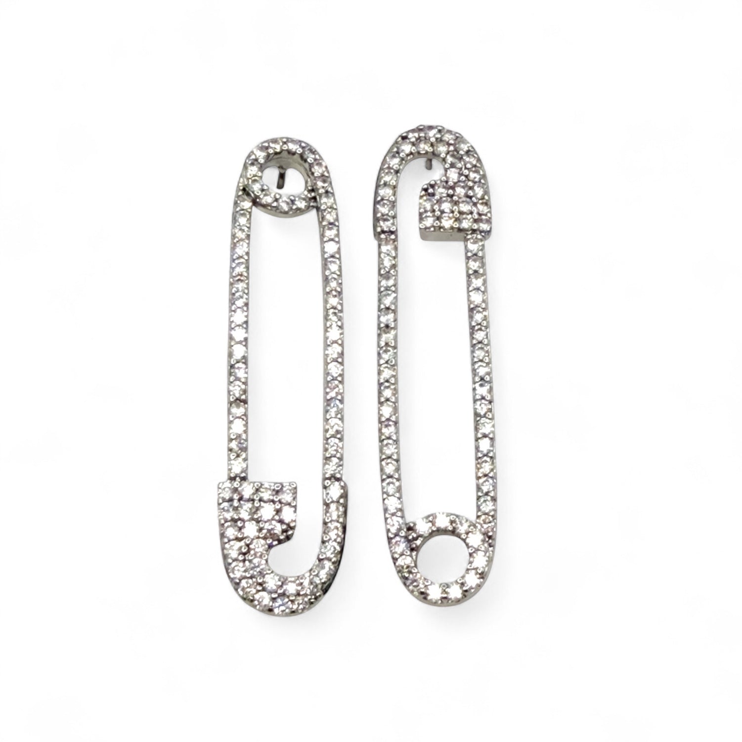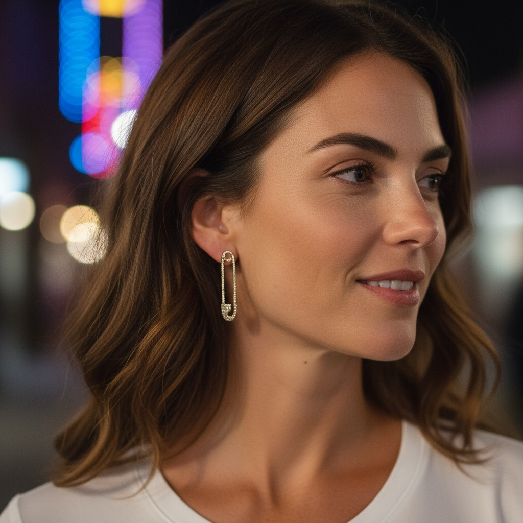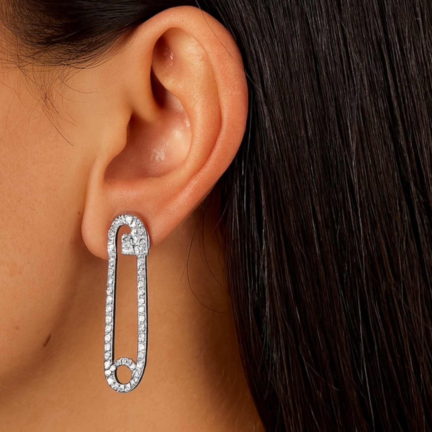 An icon of rebellion, reimagined. The Asymmetrical Safety Pin Earrings fuse punk edge with refined glamour in true Jagged Halo style. One pin open, one closed — a symbol of contrast and confidence. Each piece is encrusted with hand-set cubic zirconia that glimmers with every movement, catching light and attention in equal measure.