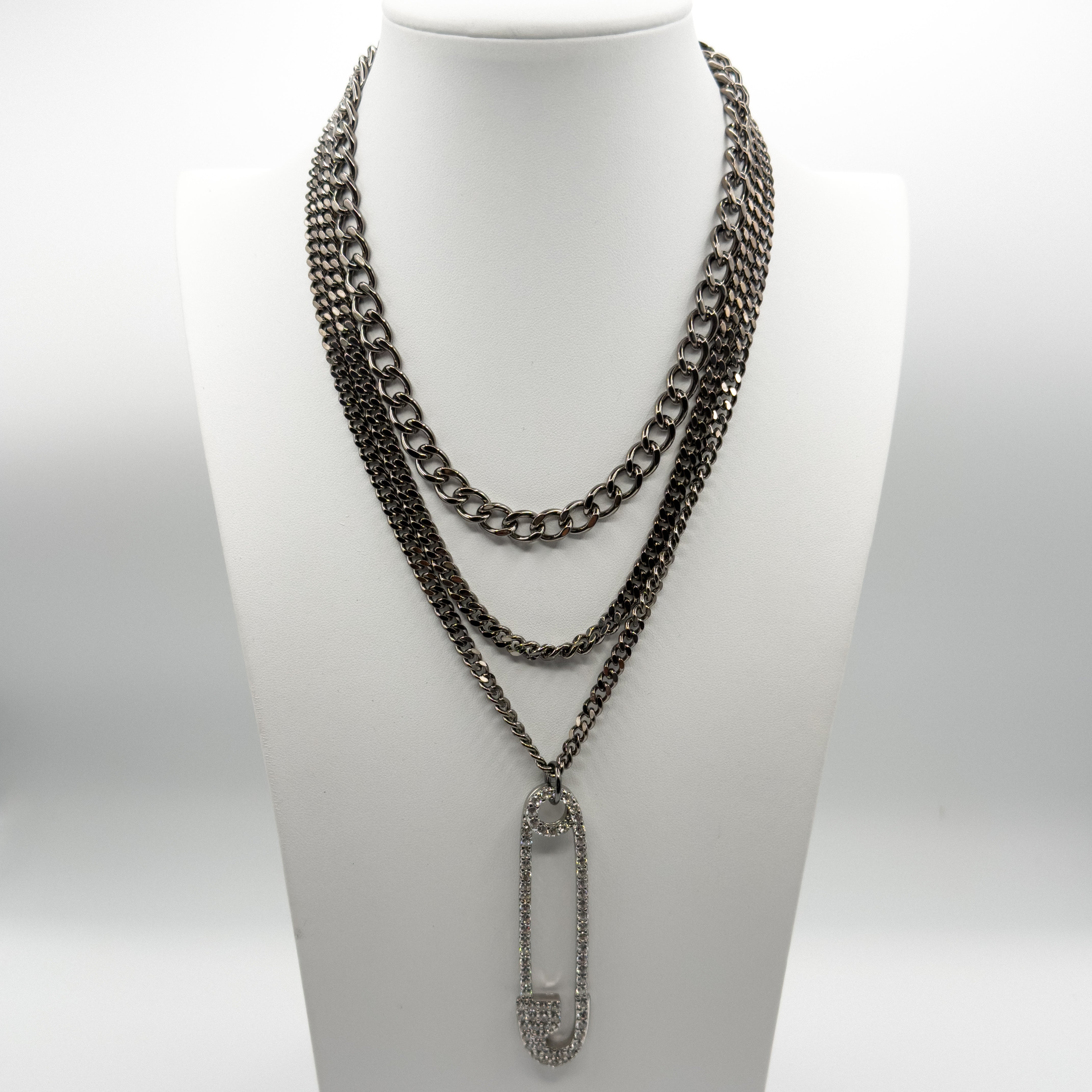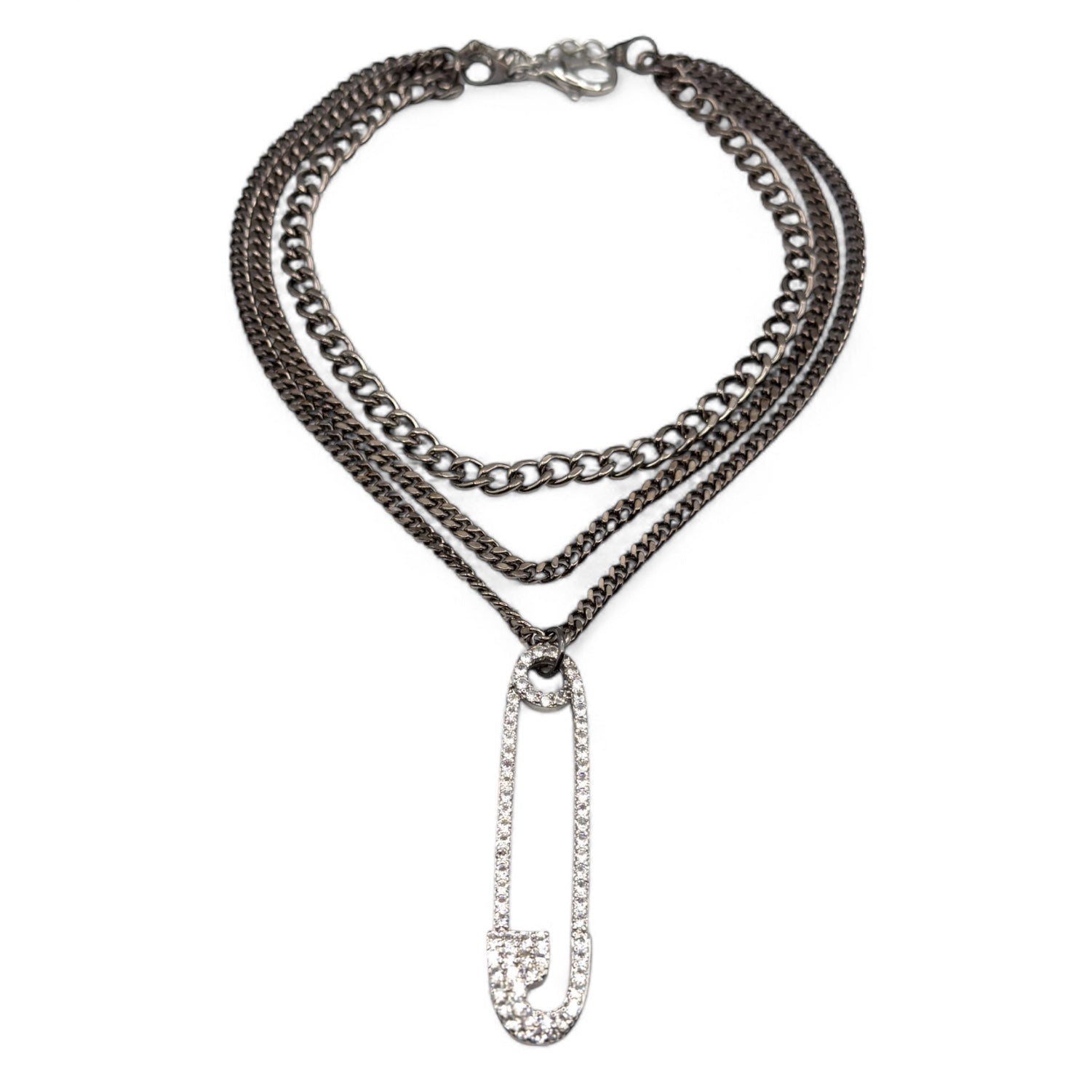 The Safety Pin Royale Necklace by Jagged Halo Jewelry fuses rebellion with refinement. Featuring a bold, layered hematite-plated curb chain and a radiant gold-filled safety-pin pendant inlaid with CZ stones, it’s a statement of strength and elegance. Designed for the daring, this necklace channels punk luxury with a high-fashion edge.